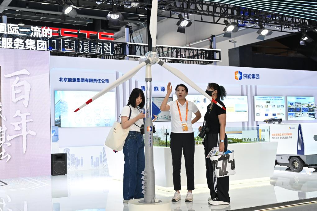 參觀者在服貿(mào)會首鋼園區(qū)京能集團展臺觀看一款新型風(fēng)機模型。新華社記者 李鑫 攝