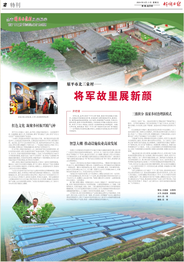 今年以來,我市以踐行“千萬工程”經(jīng)驗(yàn)、推進(jìn)鄉(xiāng)村全面振興為抓手,以精品示范村建設(shè)為引領(lǐng),加快農(nóng)村人居環(huán)境整治步伐,推動(dòng)水、電、路等基礎(chǔ)設(shè)施向村覆蓋、向戶延伸;積極調(diào)整產(chǎn)業(yè)結(jié)構(gòu),不斷壯大集體經(jīng)濟(jì);探索鄉(xiāng)村治理新模式,不斷推進(jìn)鄉(xiāng)村振興建設(shè)邁上新臺(tái)階,書寫了產(chǎn)業(yè)興、環(huán)境美、民風(fēng)淳、生活好的和美鄉(xiāng)村新篇章。本報(bào)從即日起,陸續(xù)推出“踐行‘千萬工程’經(jīng)驗(yàn)忻州在行動(dòng)”系列報(bào)道——全市精品示范村風(fēng)采展示特刊,讓精品示范村成為全市鄉(xiāng)村學(xué)習(xí)的標(biāo)桿。