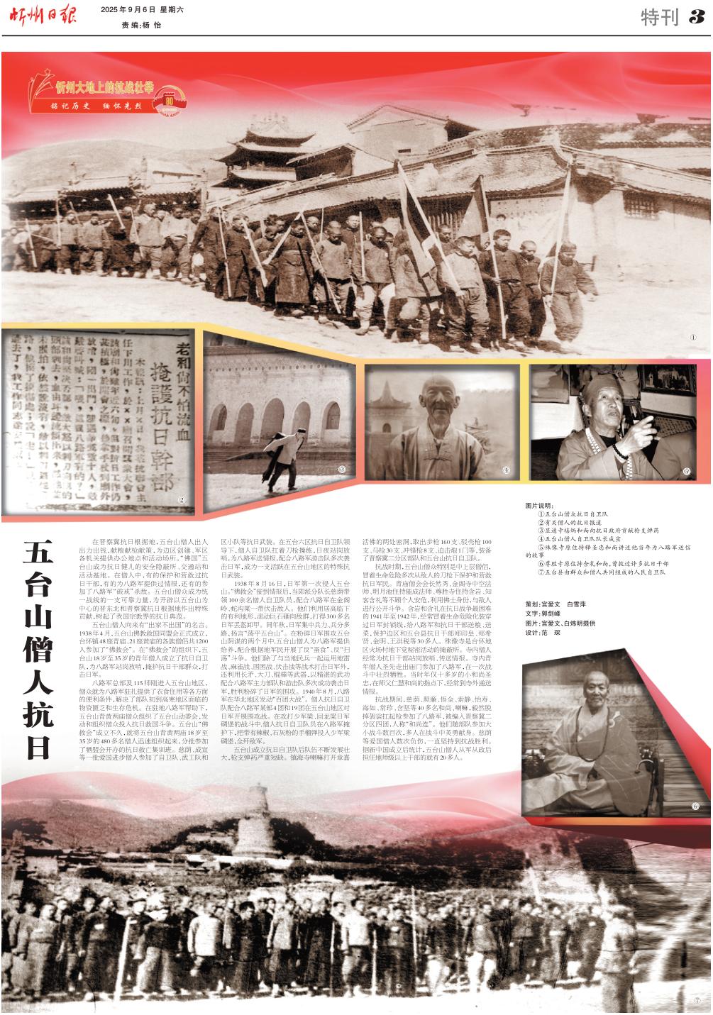 1938年8月16日,日軍第一次侵入五臺山?!胺鹁葧苯拥角閳蠛?,當(dāng)即派分隊長慈蔭帶領(lǐng)100余名僧人自衛(wèi)隊員,配合八路軍在金閣嶺、蛇溝梁一帶伏擊敵人。他們利用居高臨下的有利地形,滾動巨石砸向敵群,打得300多名日軍丟盔卸甲。同年秋,日軍集中兵力、兵分多路,揚言“蕩平五臺山”。在粉碎日軍圍攻五臺山陰謀的兩個月中,五臺山僧人為八路軍提供給養(yǎng),配合根據(jù)地軍民開展了反“蠶食”、反“掃蕩”斗爭。他們除了與當(dāng)?shù)孛癖黄疬\用地雷戰(zhàn)、麻雀戰(zhàn)、圍困戰(zhàn)、伏擊戰(zhàn)等戰(zhàn)術(shù)打擊日軍外,還利用長矛、大刀、棍棒等武器,以精湛的武功配合八路軍主力部隊和游擊隊多次成功襲擊日軍,勝利粉碎了日軍的圍攻。1940年8月,八路軍在華北地區(qū)發(fā)動“百團(tuán)大戰(zhàn)”。僧人抗日自衛(wèi)隊配合八路軍某部4團(tuán)和19團(tuán)在五臺山地區(qū)對日軍開展圍攻戰(zhàn)。在攻打少軍梁、回龍梁日軍碉堡的戰(zhàn)斗中,僧人抗日自衛(wèi)隊員在八路軍掩護(hù)下,把帶有辣椒、石灰粉的手榴彈投入少軍梁碉堡,全殲敵軍。