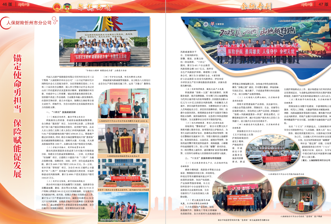 中國人民財產(chǎn)保險股份有限公司忻州市分公司(以下簡稱“人保財險忻州市分公司”)以習近平新時代中國特色社會主義思想為指導(dǎo),全面貫徹落實黨的二十大和二十屆歷次全會精神,深入學習貫徹習近平總書記對山西工作的重要講話及重要指示精神,緊緊圍繞忻州市委、市政府中心工作部署,錨定高質(zhì)量發(fā)展首要任務(wù),堅持穩(wěn)中求進工作總基調(diào),主動服務(wù)和融入新發(fā)展格局,在服務(wù)實體經(jīng)濟、助力鄉(xiāng)村振興、保障民生福祉等方面主動擔當、積極作為,為全市經(jīng)濟社會發(fā)展提供堅實有力的保險支撐。