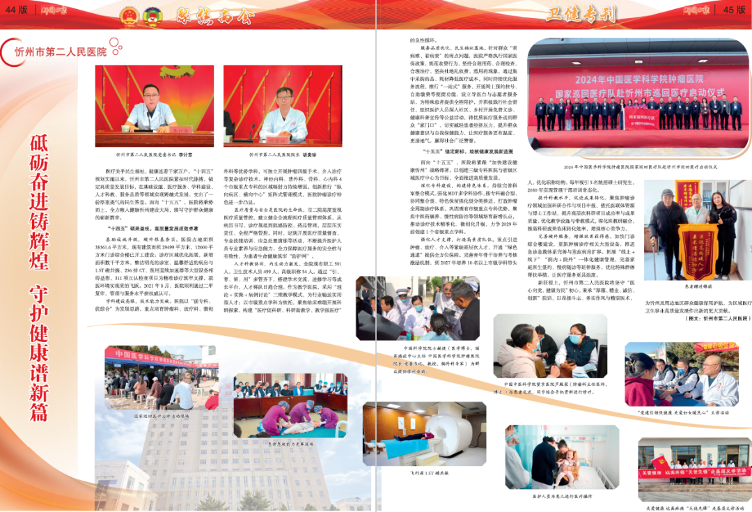醫(yī)療關(guān)乎民生福祉,健康連著千家萬戶。“十四五”規(guī)劃實施以來,忻州市第二人民醫(yī)院緊扣時代脈搏,錨定高質(zhì)量發(fā)展目標(biāo),在基礎(chǔ)設(shè)施、醫(yī)療服務(wù)、學(xué)科建設(shè)、人才科教、服務(wù)品質(zhì)等領(lǐng)域?qū)崿F(xiàn)跨越式發(fā)展,交出了一份厚重提氣的民生答卷。面向“十五五”,醫(yī)院將乘勢而上,全力融入健康忻州建設(shè)大局,續(xù)寫守護群眾健康的嶄新篇章。