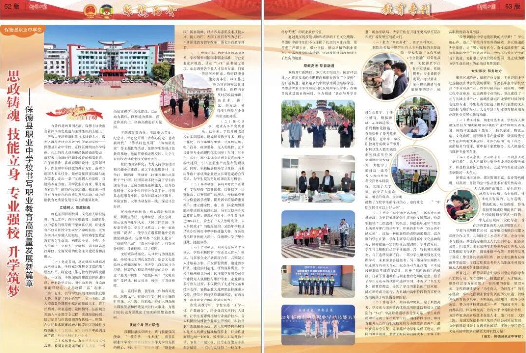 回首過去,保德縣職業(yè)中學校以堅定的信念和扎實的行動,在立德樹人、技能培育、人才輸送、服務社會等方面交出了一份亮眼的答卷。展望未來,學校將繼續(xù)堅守“為黨育人、為國育才”的初心使命,牢牢把握職業(yè)教育發(fā)展的歷史機遇,持續(xù)深化教育教學改革,不斷強化內(nèi)涵建設,提升辦學質(zhì)量。努力將學校建設成為一所“當?shù)仉x不開、業(yè)內(nèi)都認同、國際可交流”的高水平中等職業(yè)學校,為培養(yǎng)更多高素質(zhì)技術技能人才、能工巧匠、大國工匠,為助力保德縣及區(qū)域經(jīng)濟社會高質(zhì)量發(fā)展,為全面建設社會主義現(xiàn)代化國家、實現(xiàn)中華民族偉大復興的中國夢貢獻更大的職教力量!